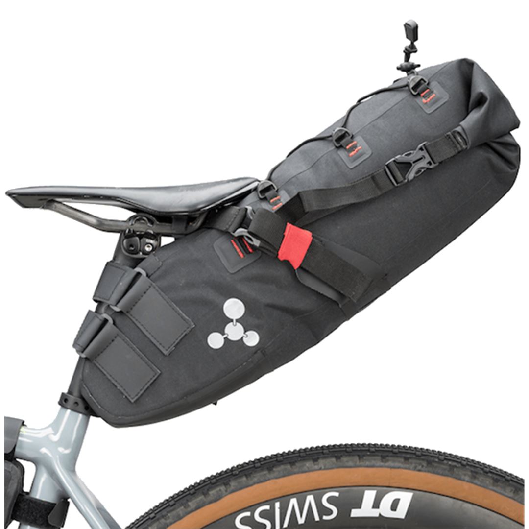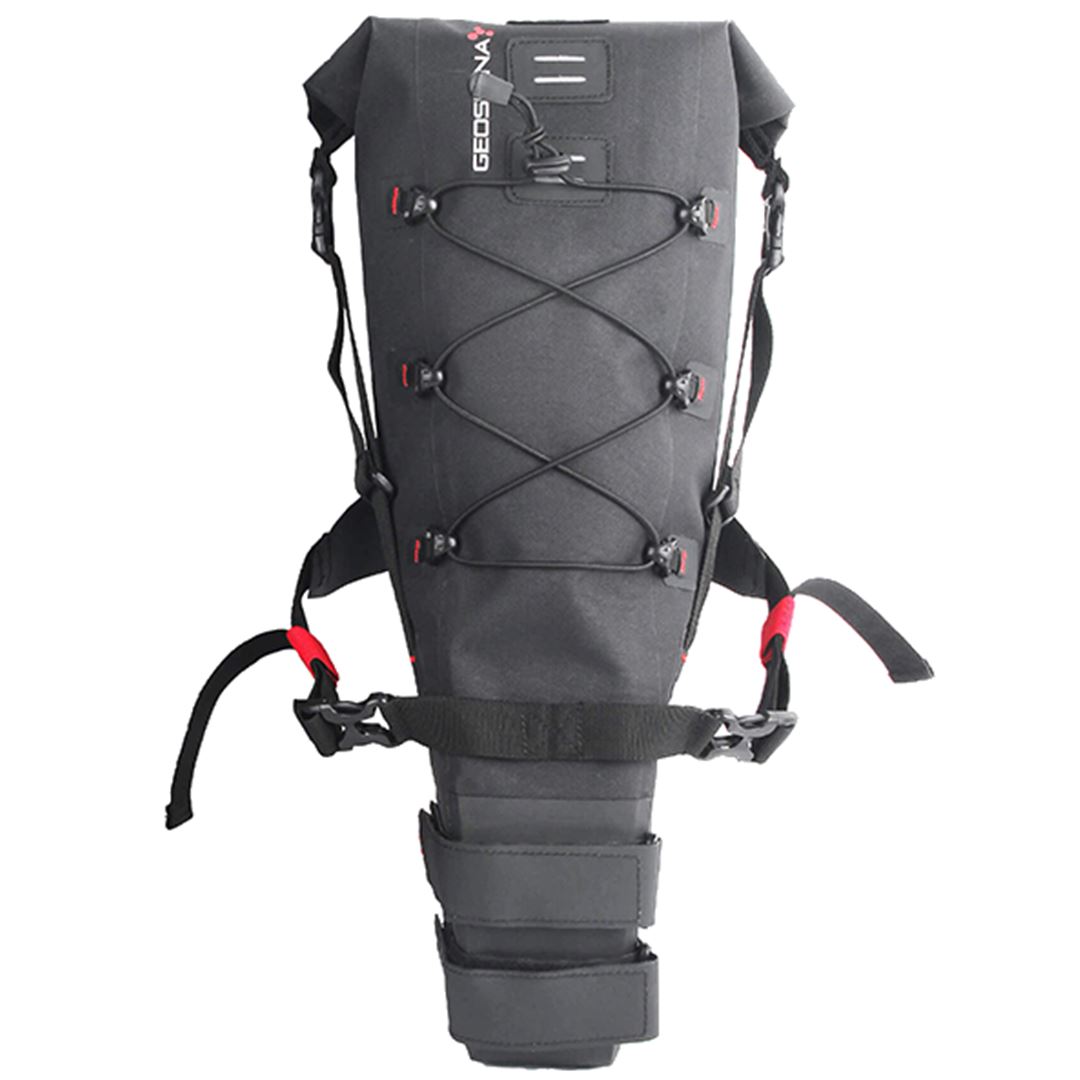 Nuevas bolsas de silli´n pequeñas Geosmina de 10 litros fabricadas enteramente en Nylon 600D e Hypalon y con las costuras selladas mediante Alta Frecuencia. Este Nylon es totalmente impermeable y lleva un tratamiento externo de PU (Poliuretano) que repele el agua y hace que la bolsa se seque ra´pidamente en contacto con el aire. La bolsa lleva una una peli´cula de TPU (Poliuretano Termopla´stico) que junto con las costuras selladas, hacen que la bolsa sea totalmente estanca. Se fija a la bici mediante dos redisen~adas correas de Velcro. Dos tiras de Velcro reforzado con Hypalon y de gran seccio´n se fijan a la tija de silli´n y otras dos los rieles de este, tambie´n sobredimensionadas. Estas u´ltimas correas incluyen tensores y cierres YKK de alta resistencia para poder tensar la bolsa con mayor fuerza y que permanezca bien agarrada a la tija de silli´n.