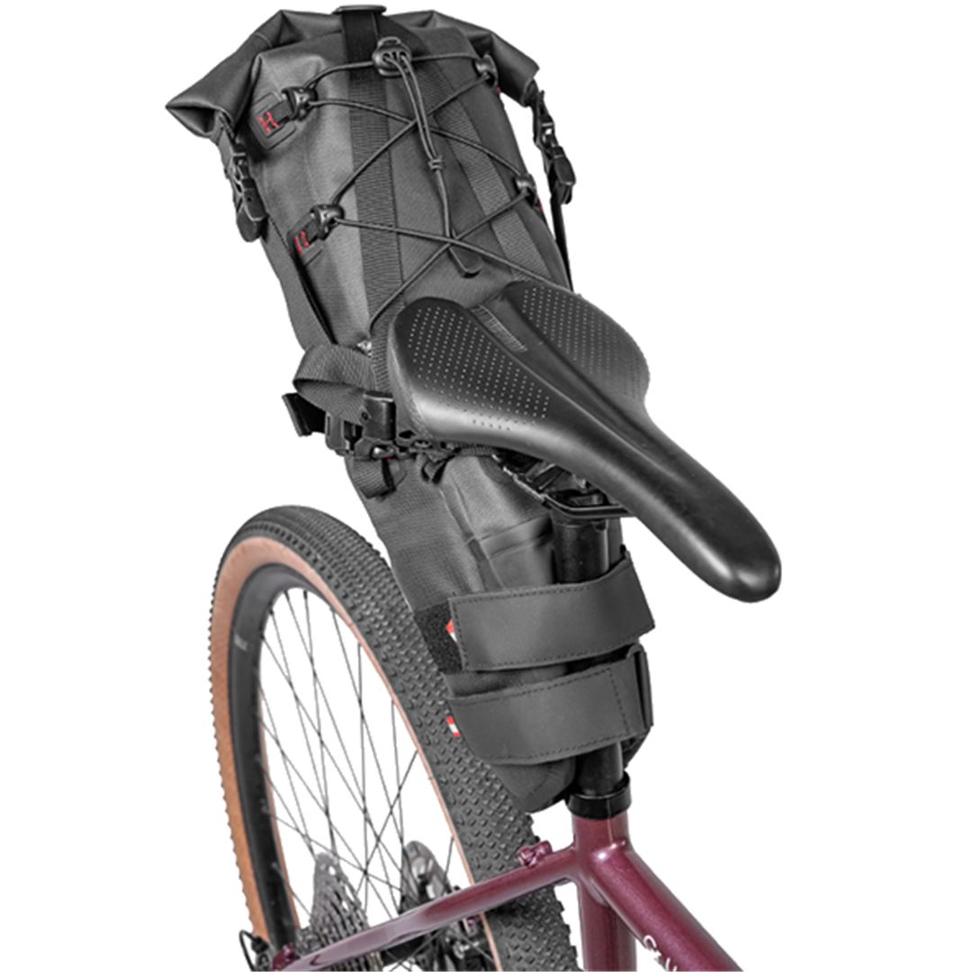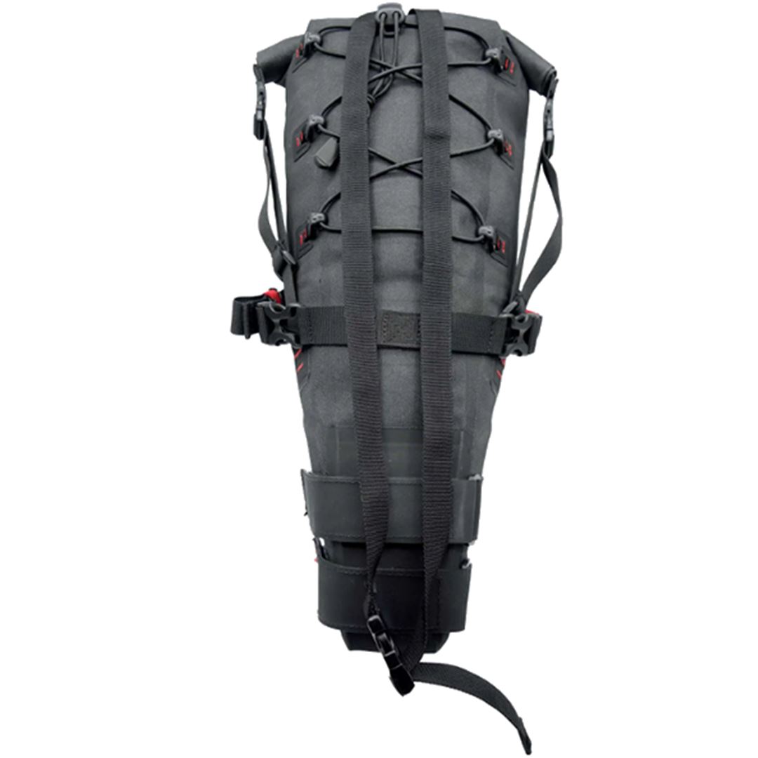 Este Nylon es totalmente impermeable y lleva un tratamiento externo de Poliuretano, que repele el agua y hace que la bolsa se seque ra´pidamente en contacto con el aire. La bolsa lleva una una peli´cula de Poliuretano Termopla´stico, que junto con las costuras selladas, hacen que la bolsa sea totalmente estanca. Se fija a la bici mediante dos correas de Velcro reforzado con Hypalon y de gran seccio´n se fijan a la tija de silli´n y otras dos los rieles de este, tambie´n sobredimensionadas. Estas u´ltimas correas incluyen tensores y cierres YKK de alta resistencia para poder tensar la bolsa con mayor fuerza y que permanezca bien agarrada a la tija de silli´n.