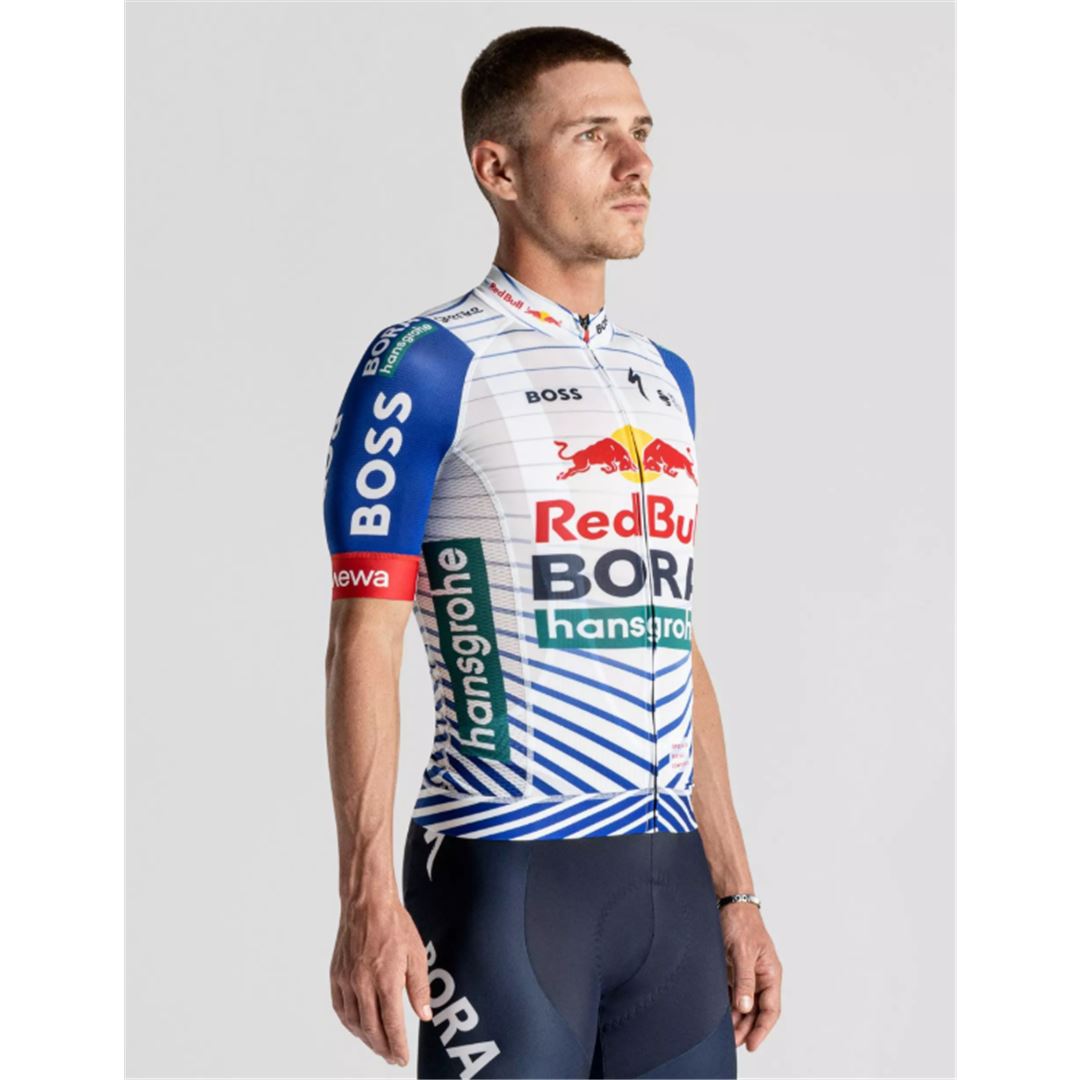 Muestra tu apoyo al Red Bull - BORA - hansgrohe con este maillot de manga corta que lleva los gráficos oficiales del equipo y un diseño inspirado en el ciclismo profesional. El tejido elástico de punto plano en la parte delantera y la malla transpirable en la parte trasera y en las mangas te mantienen fresco y cómodo, y la protección UPF 30+ protege tu piel del sol. Los puños elásticos y el dobladillo hacen que no se mueva de su sitio, y los tres bolsillos traseros junto con la cremallera completa añaden un toque de funcionalidad. El ajuste ceñido ofrece comodidad sin restricciones, perfecto para cualquier ciclista.